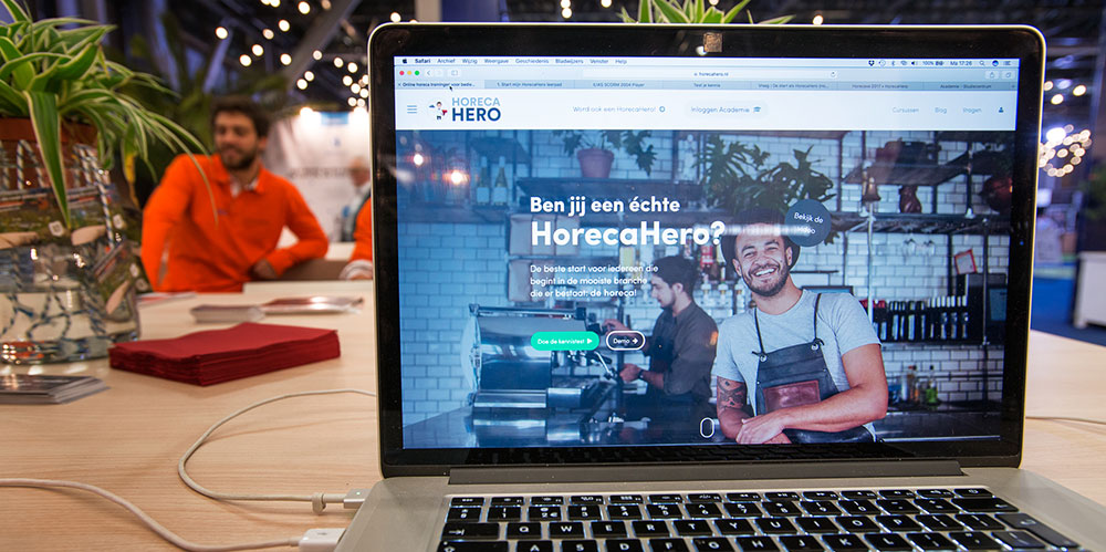,,Digitaal opleiden is goedkoop, flexibel en past bij deze tijd. Onze slogan is: ‘Ben jij een echte HorecaHero?’ Je kunt je kennis testen op onze website, die al door 3.000 bezoekers is ingevuld. Maar liefst 86 procent slaagt niet. Het blijkt dat de basale horecakennis bij hen ontbreekt.